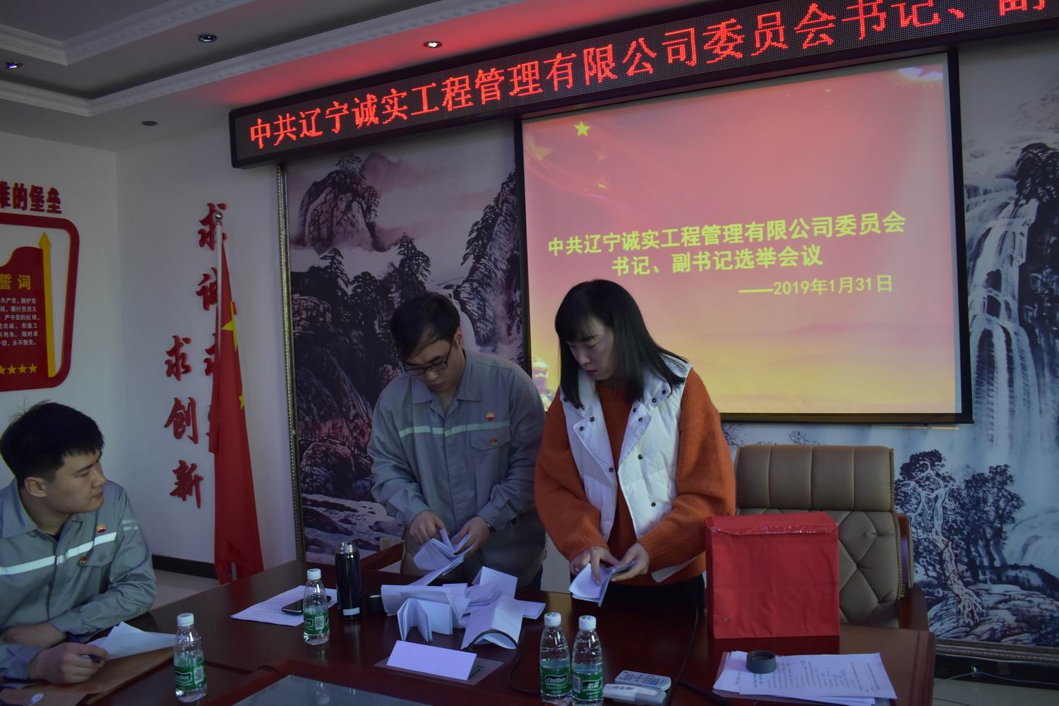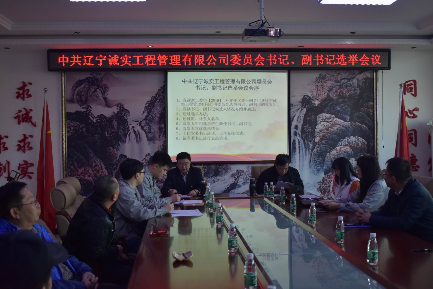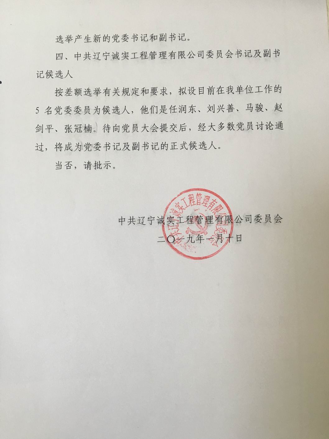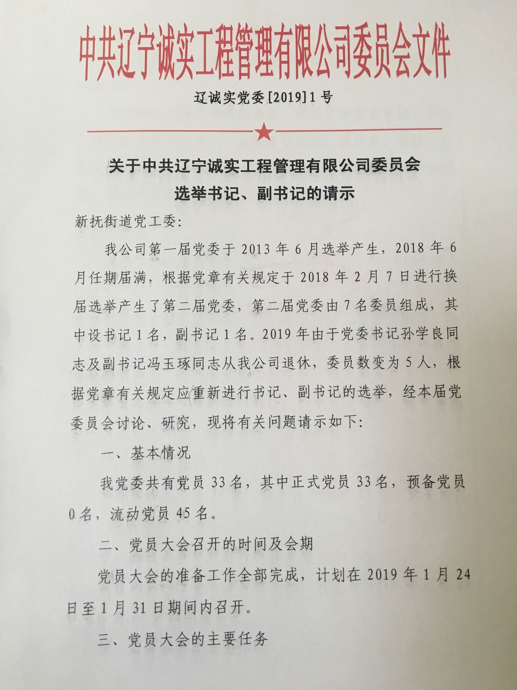 我公司第一届党委于2013年6月选举产生,2018年6月任期届满,根据党章有关规定于2018年2月7日进行换届选举产生了第二届党委,第二届党委由7名委员组成,其中设书记1名,副书记1名。2019年由于党委书记孙学良同志及副书记冯玉琢同志从我公司退休,委员数变为5人,根据党章有关规定应重新进行书记、副书记的选举。我公司于2019年1月10日申请换届,并于2019年1月16日得到批复。