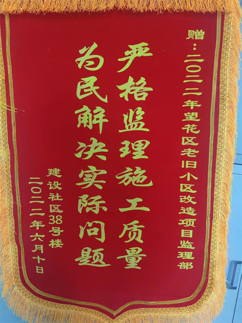 千涛万漉虽辛苦,吹尽狂沙始到金。一面锦旗既是一份肯定。我们将秉承“诚实、责任、专业、超越”的监理精神,接受政府和市民的共同监督,一如既往、不忘初心、尽职尽责,为推动老旧小区改造,优化小区环境治理,建设文明城市做出应有的贡献!