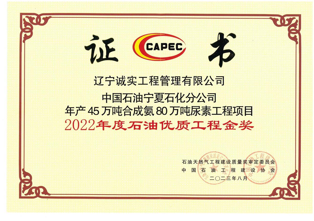 祝贺辽宁诚实参建的“中国石油宁夏石化分公司年产45万吨合成氨80万吨尿素工程项目”荣获2022年度石油优质工程金奖!这是一份迟到的荣誉,但是却未曾缺席。