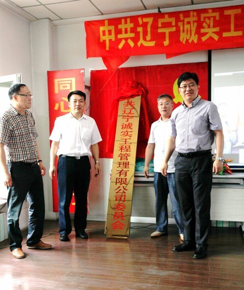 中共抚顺市委组织部领导李劲夫(右二)、中共新抚区委副书记罗玉生(左二)、新抚区委常委组织部长  隋淑贵(右一)、半岛电子中国董事长赵华(左一)为中共半岛电子中国委员会揭牌